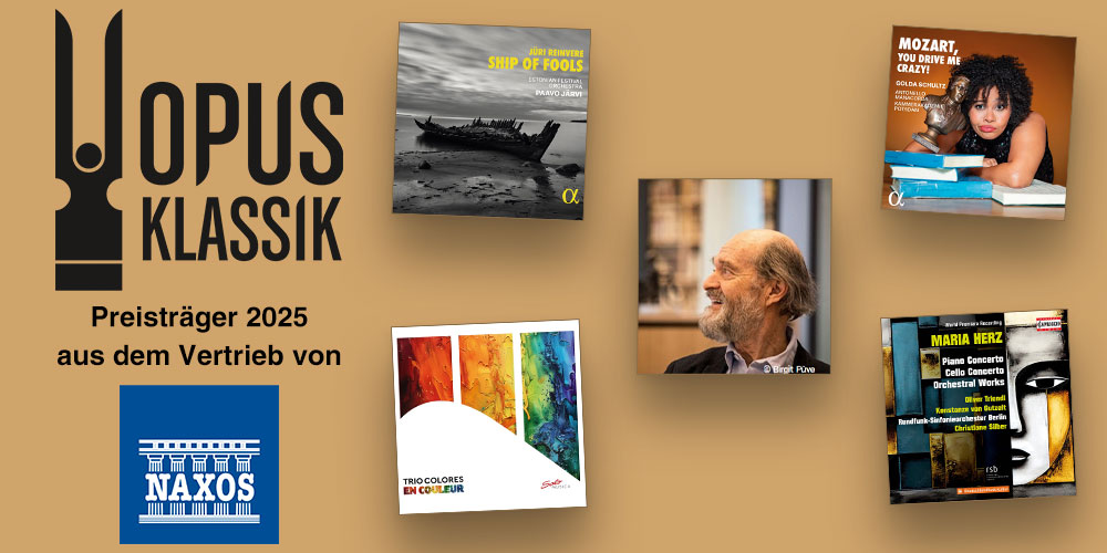 Wir freuen uns über fünf OPUS Klassik-Auszeichnungen in den Kategorien „Komponist*in des Jahres“, „Würdigung des Lebenswerkes einer Künstlerin/ eines Künstlers“, „Solistische Einspielung Gesang des Jahres“, „Klassik ohne Grenzen“ und „Weltersteinspielung des Jahres“, die in Verbindungen zu Aufnahmen stehen, die im Vertrieb von NAXOS Deutschland sind!